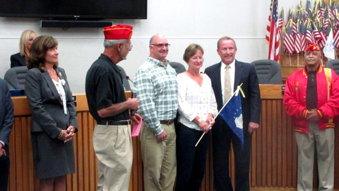 Present on behalf of Harman was his parents, Patti and Eric. Led by chairman Barry Moore, and surrounded by the Marine Corps League Patriot Detachment, Veterans Advisory Commission members and other veterans, the pair placed their son’s Air Force flag in the display, where it will wait until its owner’s safe return to the states.