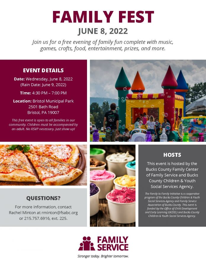 Family Service Association announced the return of its annual Family Fest on June 8, from 4:30 to 7 p.m. at Bristol Municipal Park, 2501 Bath Road, Bristol. This free event last took place three years ago, prior to the pandemic.