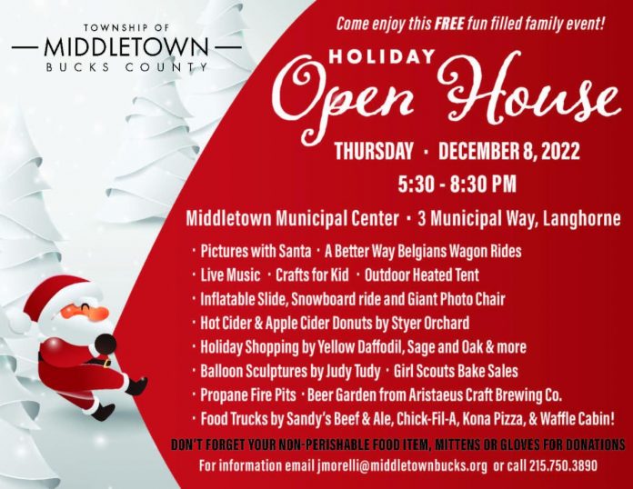 Middletown Township is hosting its annual Holiday Open House on Thursday, Dec. 8, from 5:30 to 8:30 p.m. at the Middletown Municipal Center.