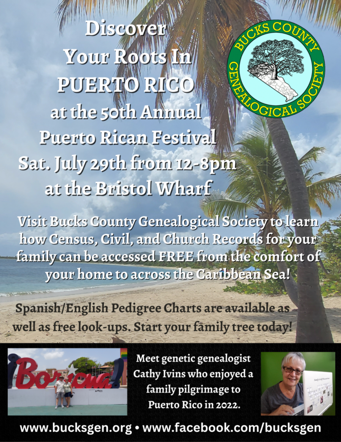 On Saturday, July 29, the Bucks County Genealogical Society is participating in the 50th annual Puerto Rican Festival at the Bristol Wharf. Hosted by the Puerto Rican Cultural Association of Bucks County, the event also features cultural food, music, dancing, cooking demonstrations, children’s activities and vendors from noon to 8 p.m.